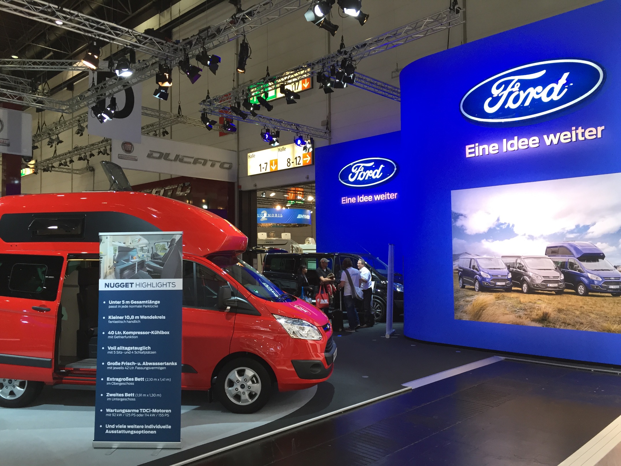 Naast VW staat aan de ene kant Mercedes-Benz, onder meer met de Westfalia Marco Polo, en aan de andere kant Ford met z’n Nuggets. Later meer over de Nuggets, de Marco Polo en natuurlijk de stand van Westfalia Mobil met de nieuwe Westy’s Kepler en Jules Verne!